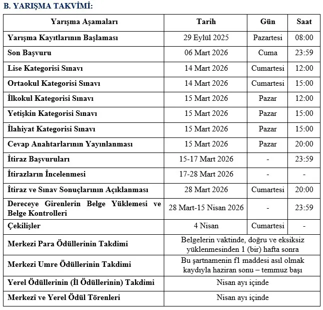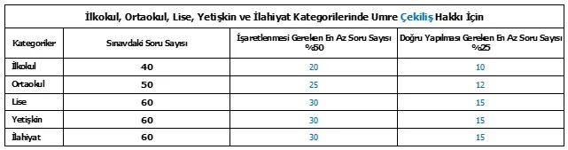 f.5. İlkokul, ortaokul, lise, ilahiyat ve yetişkin kategorilerindeki bir yarışmacının umre çekilişine dahil olabilmesi için; sınava girmiş, soruların %50’sini cevaplamış ve tüm soruların en az %25’ine doğru cevap vermiş olması gereklidir. (Bakınız Tablo-1)