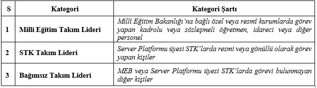 Milli Eğitim Takım Lideri, STK Takım Lideri, Bağımsız Takım lideri Kategorilerinin puanlaması aşağıdaki sistemle yapılacaktır: