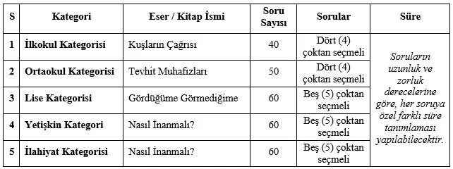 1. Yarışma, aşağıdaki kategoriler için belirlenen eserler/kitaplar ve belirlenen soru miktarlarıyla çevrimiçi (online) olarak yapılacaktır: