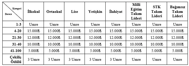 f.6. Takım liderinin umre çekilişine dahil olabilmesi için; en az 10 yarışmacısının sınava girmiş, sınava giren bu yarışmacılarının soruların %50’sini cevaplamış ve tüm soruların en az %25’ine doğru cevap vermiş olması gereklidir. (Bakınız Tablo-1)